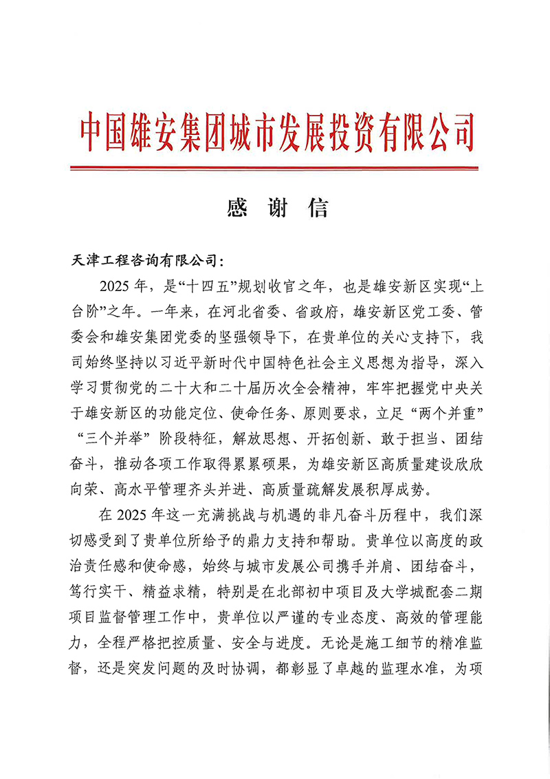 雄安集團城發公司發來感謝信,對天津咨詢在雄安新區實現“上臺階”年之際,在北部初中、大學城配套二期項目監理全過程中,以高度責任感和使命感,嚴控質量安全進度,精準監督施工細節、及時協調突發問題,以專業、嚴謹、高效筑牢項目根基,為新區建設添力。
