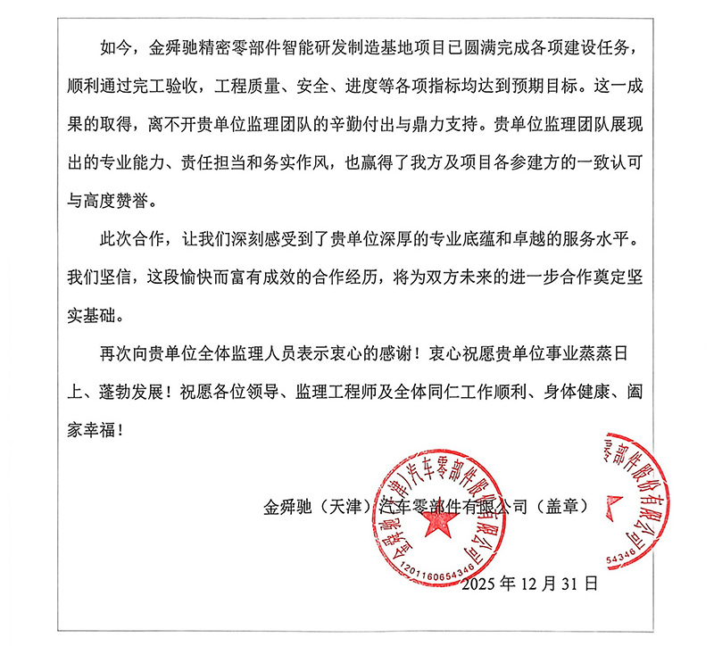 天津華勘穗金房地產公司、中同銀龍(天津)公司也先后發來表揚信,對天津咨詢河東金貿產業園區11-D、15號項目團隊和中同銀龍(天津)滅菌中心建設項目的監理工作予以表揚感謝,認為我司項目監理部積極主動對接業主需求,溝通協調參建各方,過程中加強技術管理支撐和質量安全風險防控,用“事事落地、件件閉環”的擔當,筑牢項目落地的責任防線,用實際行動詮釋了優質監理服務的內涵。