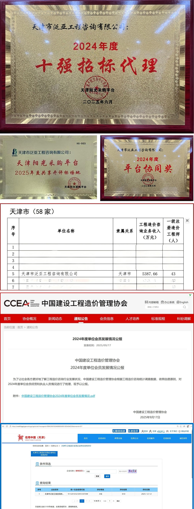 天津咨詢所屬泛亞工程咨詢有限公司保持招標代理行業“領頭羊”地位,在天津陽光采購平臺2024年度招標代理執業評價工作中,榮獲“年度十強招標代理&平臺協同”“2025年度共享開評標場地”等榮譽稱號。泛亞咨詢還持續深化造價咨詢服務,取得2025年度天津市住建委造價企業信用等級A級認證,在中國建設工程造價管理協會2024年度排名中穩居天津市前5名。2025年,泛亞咨詢參加首屆全國招標采購專業技能斬獲多個獎項。泛亞咨詢充分展示行業領先水平,參加全國招標采購專業技能大賽,獲得天津賽區團體賽一等獎;3名員工包攬個人一、二、三等獎;22名員工分別榮獲優秀獎、潛力獎。泛亞咨詢受邀代表天津市參加全國行業大賽,經過激烈角逐,最終斬獲全國首屆招標采購專業技能大賽一等獎、數字創意獎。天津市建設工程造價和招投標管理協會為此特發來賀信予以祝賀肯定。
